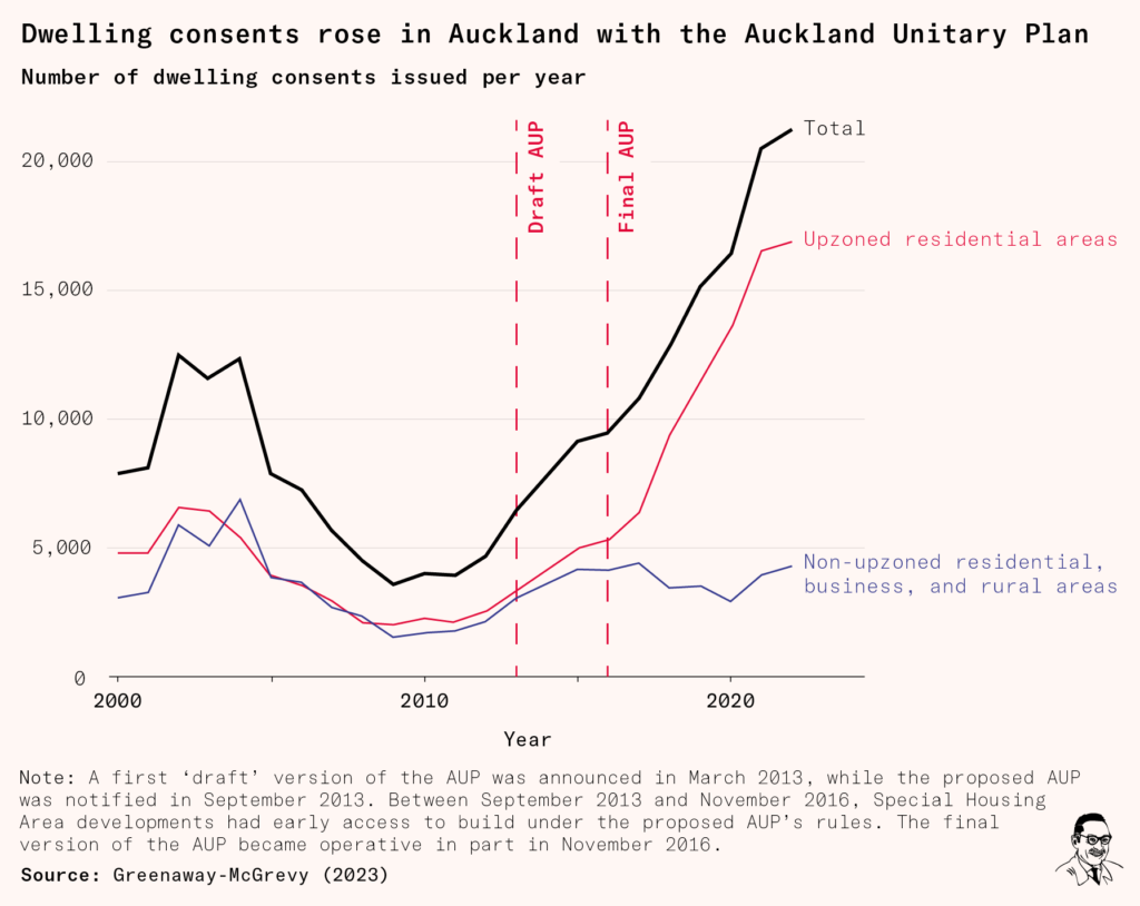 The 2016 Auckland Unitary Plan is widely regarded as one of the first tests of broad upzoning globally. Six years on from implementation, it has proven that widespread, comprehensive upzoning can induce new housing supply and thus improve affordability.