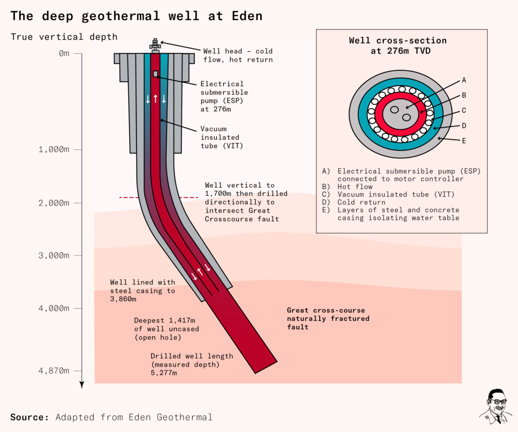 All this goes to illustrate the technical challenge of deep drilling. It is not easy; and we’re only just beginning to master it. Another challenge is the dearth of clarity over regulation from the Health and Safety Executive (HSE), which is the UK government agency that oversees occupational risk. Because the HSE does not have specific geothermal regulations, Eden had to default to full oil and gas regulation, whose lack of suitability cost the project money and time. (For example, Grand’s team had to hire, and regularly test, a ‘blowout preventer’: a piece of kit that prevents the uncontrolled release of natural gas, or crude oil, from within a well. The geothermal well contained neither natural gas nor crude oil, and the hiring of the blowout preventer and its operators cost the project, Grand says, tens of thousands of pounds per day.) A similar lack of regulatory clarity affects the geothermal industry in many other places. In America, for instance, many states have not yet clarified who owns the mineral rights to the heat accessed by deep drilling.