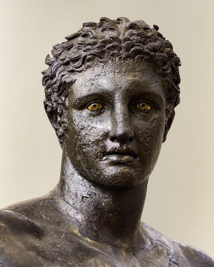 One of the treasures recovered from the first-century BC Antikythera shipwreck, this statue is composed of bronze with inlaid stone eyes. It has been variously interpreted as representing Paris, Perseus, or a youthful Heracles. Whatever interpretation is correct, it is a stunning work of art.
