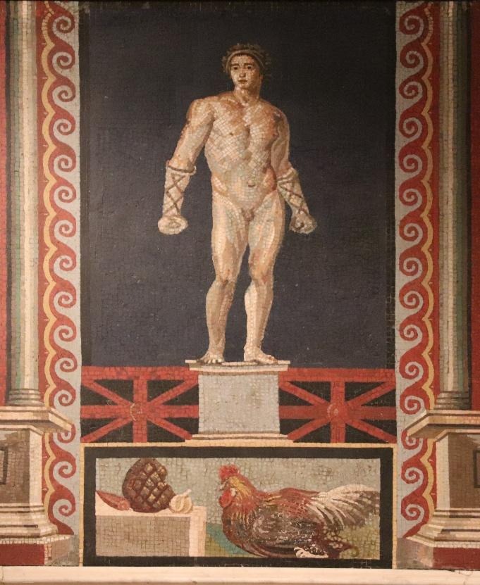 In other cases the colors are richer. Here too, however, the effect is far from ugly. I have given an example of this below a famous mosaic depicting a statue of a boxer, from the Villa San Marco in Stabiae. Note the subtlety of color recorded by the mosaic, in which the boxer is reddened and sunburned on his shoulders and upper chest, but not his pale upper thighs. There is nothing here to suggest that the statues depicted would have struck a modern viewer as garish.