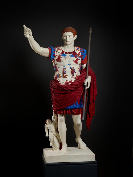 Here is another Roman statue, this time depicting the Emperor Augustus. It is called the Augustus of the Prima Porta after the site where it was discovered. Something interesting about this statue is that traces of paint survive on its surface. This is because, like most though not all ancient statues, it was originally painted.