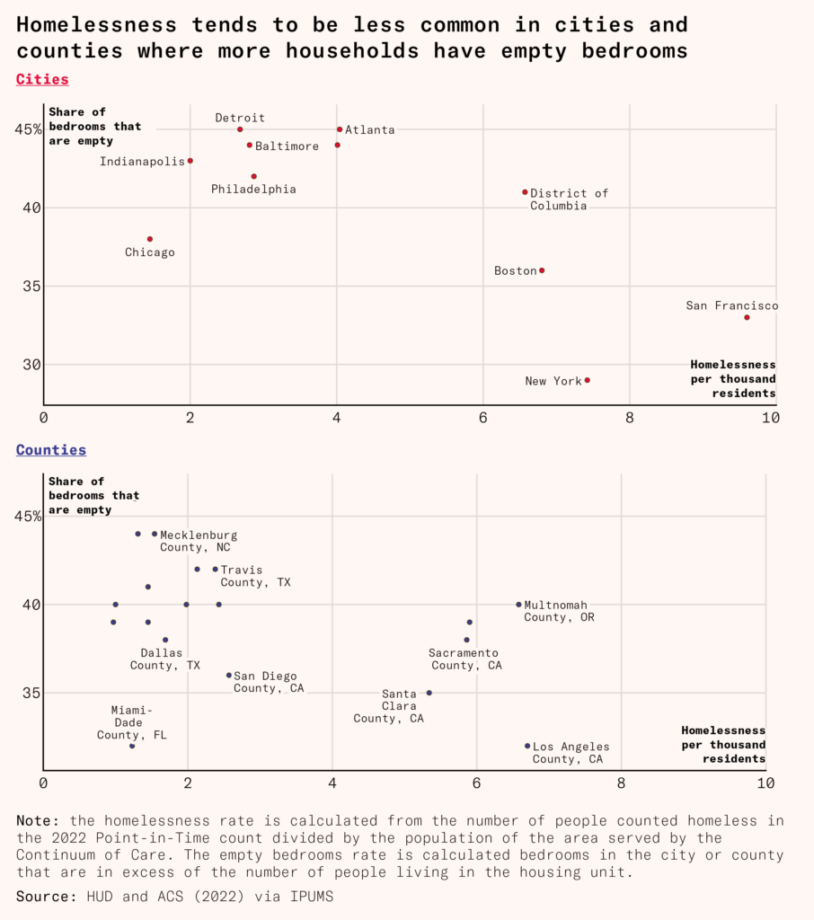 To measure the vacant space that might be available for nonmarket, relational transactions, I measure how many empty bedrooms there are in occupied homes in each city and county. Empty bedrooms are more common in poorer, low-rent cities than richer, high-rent ones. These data tell Sherman’s story at a macro scale: middle-aged people in suburban Ohio, for example, are more likely to have an extra bedroom they can offer to an adult child than are middle-aged people in suburban Los Angeles. Consistent with this story, the chart below shows that the homelessness rate is strongly negatively correlated with the prevalence of empty bedrooms.