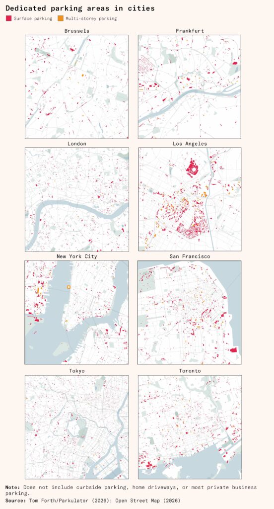 Since parking on public land is banned, municipalities are not worried about overspill parking from developments with inadequate private parking. They therefore have no reason to impose parking minimums on developments: the market is left to decide whether parking is the most valuable use of private land. Where land is abundant, as in rural areas, suburbs, or small towns, private parking is plentiful. But in city centers, it is outcompeted by other land uses. According to the late Donald Shoup, central Tokyo has 23 parking spaces per hectare and 0.04 parking spaces per job, compared with 263 and 0.52 for Los Angeles. Even Manhattan, the densest urban area in North America with the lowest levels of car ownership, has about 60 parking spaces per hectare.
