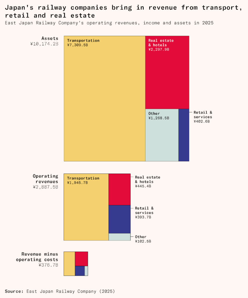Core rail operations are profitable for every Japanese private railway company, but they usually only account for a plurality or a small majority of revenue. The rest is contributed by their portfolio of side businesses. There is a natural financial synergy between the reliable but unremarkable cash flow of train fares and the profitable but riskier real estate and commercial side of the business. Railway companies’ side businesses also attract people to live and work on their rail corridor, reinforcing the customer base for the railway services themselves.