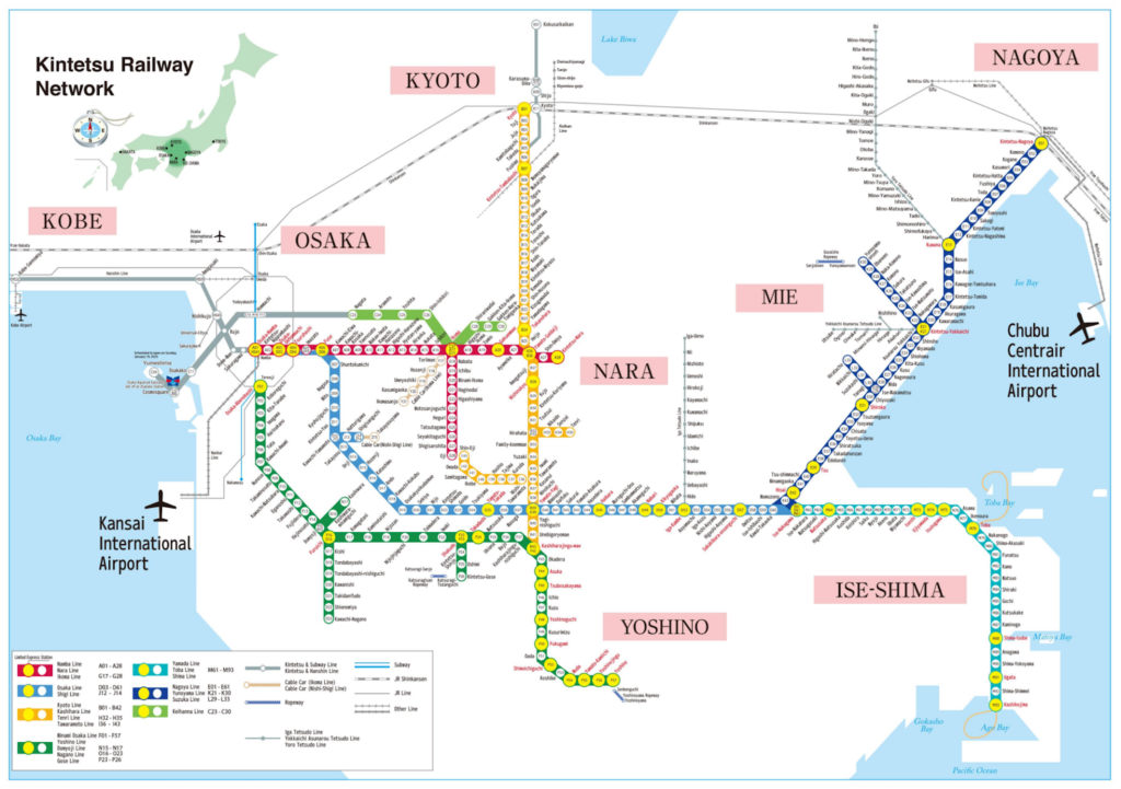 These companies are today known as ‘legacy private railways’ on account of their having been private since their inception. There are eight legacy private railways in the Tokyo metropolitan area, five in the Osaka–Kobe–Kyoto megalopolis, two in Nagoya, and one in the fourth city of Fukuoka. There are also dozens of smaller ones elsewhere. In the three largest urban areas, these operators account for nearly half of railway track and stations, as well as a plurality of ridership. The largest, Kintetsu, not only operates urban services, but a whole intercity network stretching from Osaka to Nagoya.