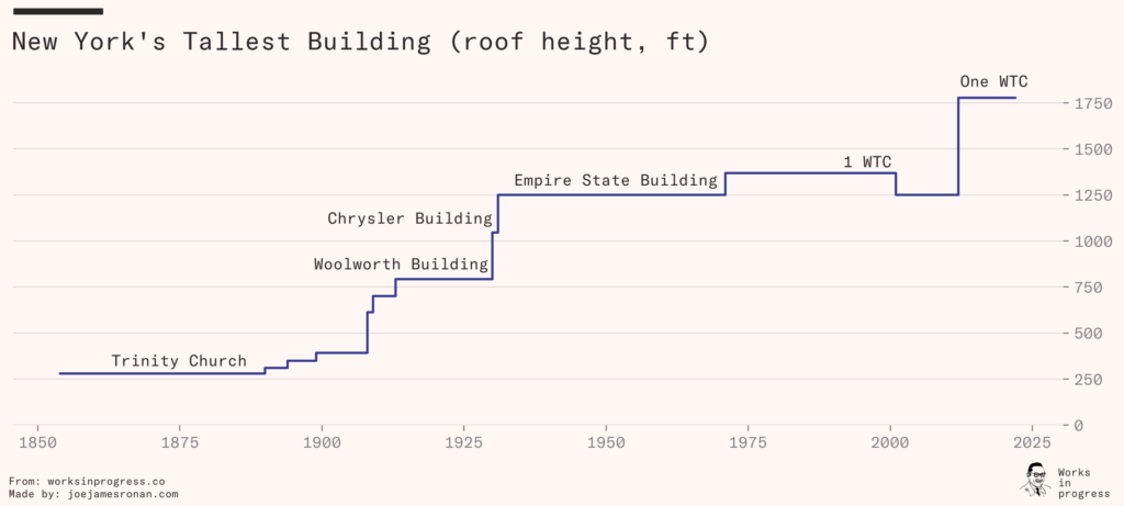 After the 1916 zoning law, a building’s height remained unrestricted, but only up to ¼ of the lot – any construction on the remainder of the lot was required to have a series of step-backs as the building got taller, resulting in a distinct “layer cake” style. The Empire State Building is an example of this sort of construction, though its large lot means it needed relatively few step-backs.